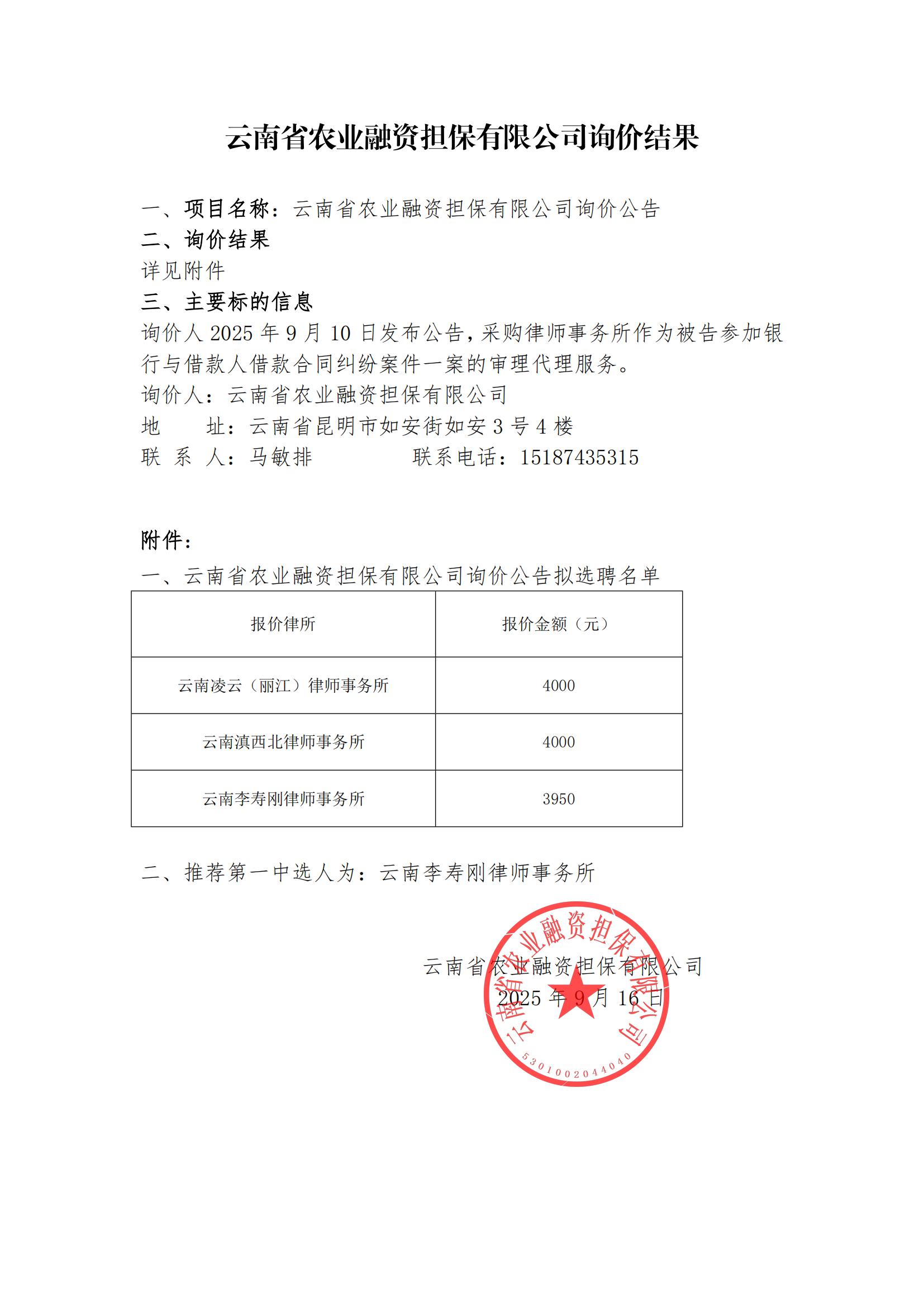 云南省農(nóng)業(yè)融資擔保有限公司詢價結果